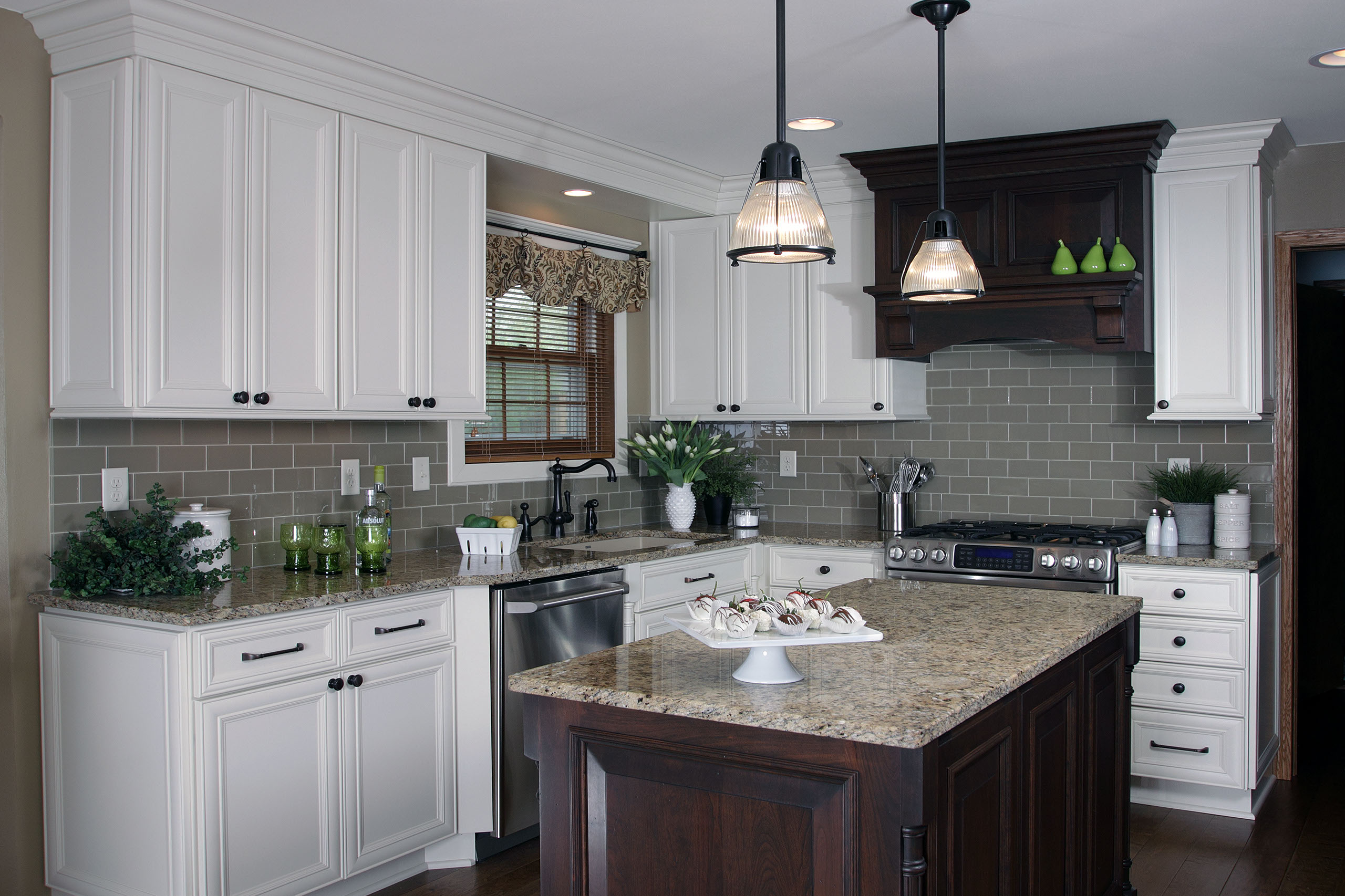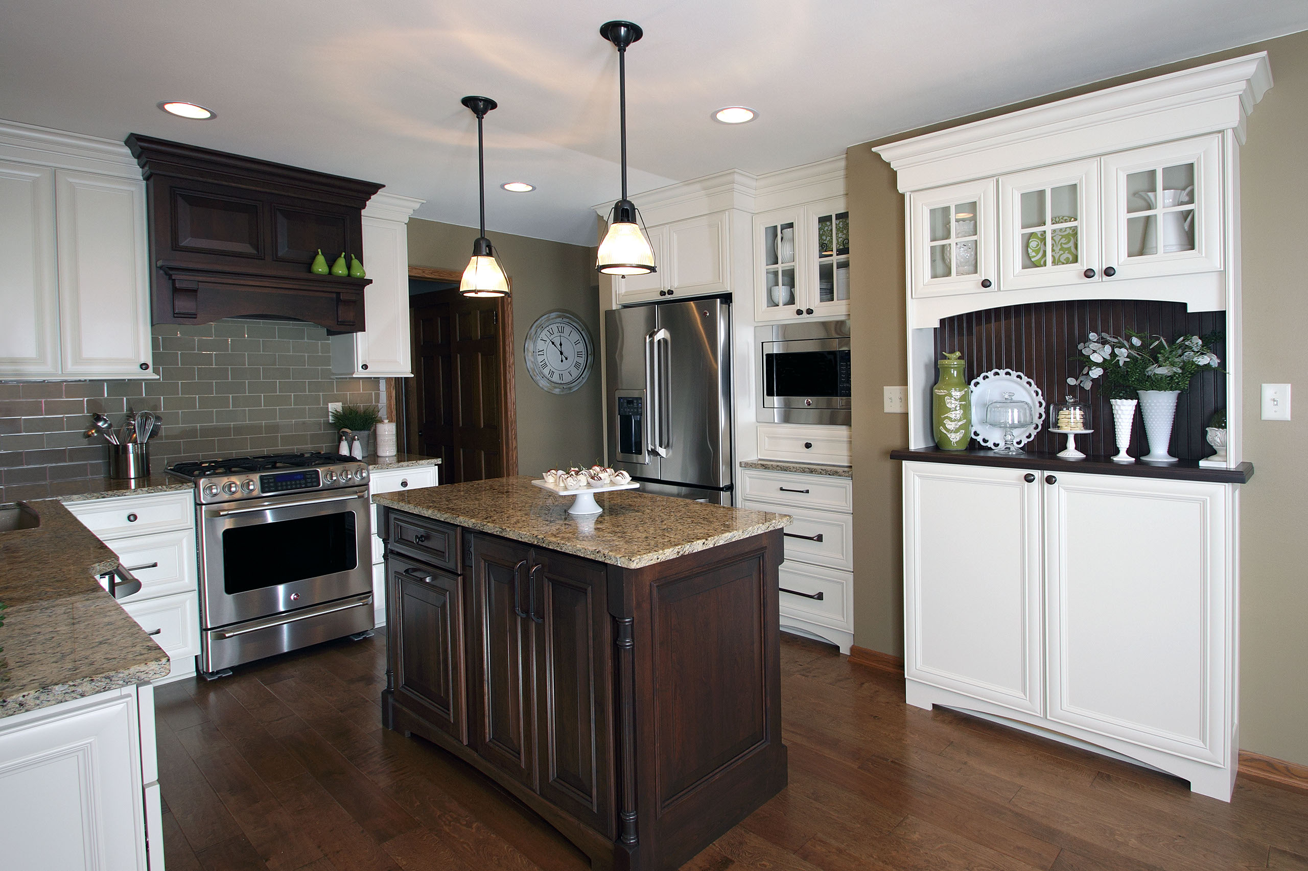 Cherry Dura Supreme cabinets work well with the white painted perimeter cabinets. Toupe glass tile in a traditional subway shape modernizes the space and keeps the look clean. An added hutch in a 10” depth helps provide extra storage. The engineered hardwood floor was added to complete the floor plan. Color can be popped in as the holidays change with the seasons.