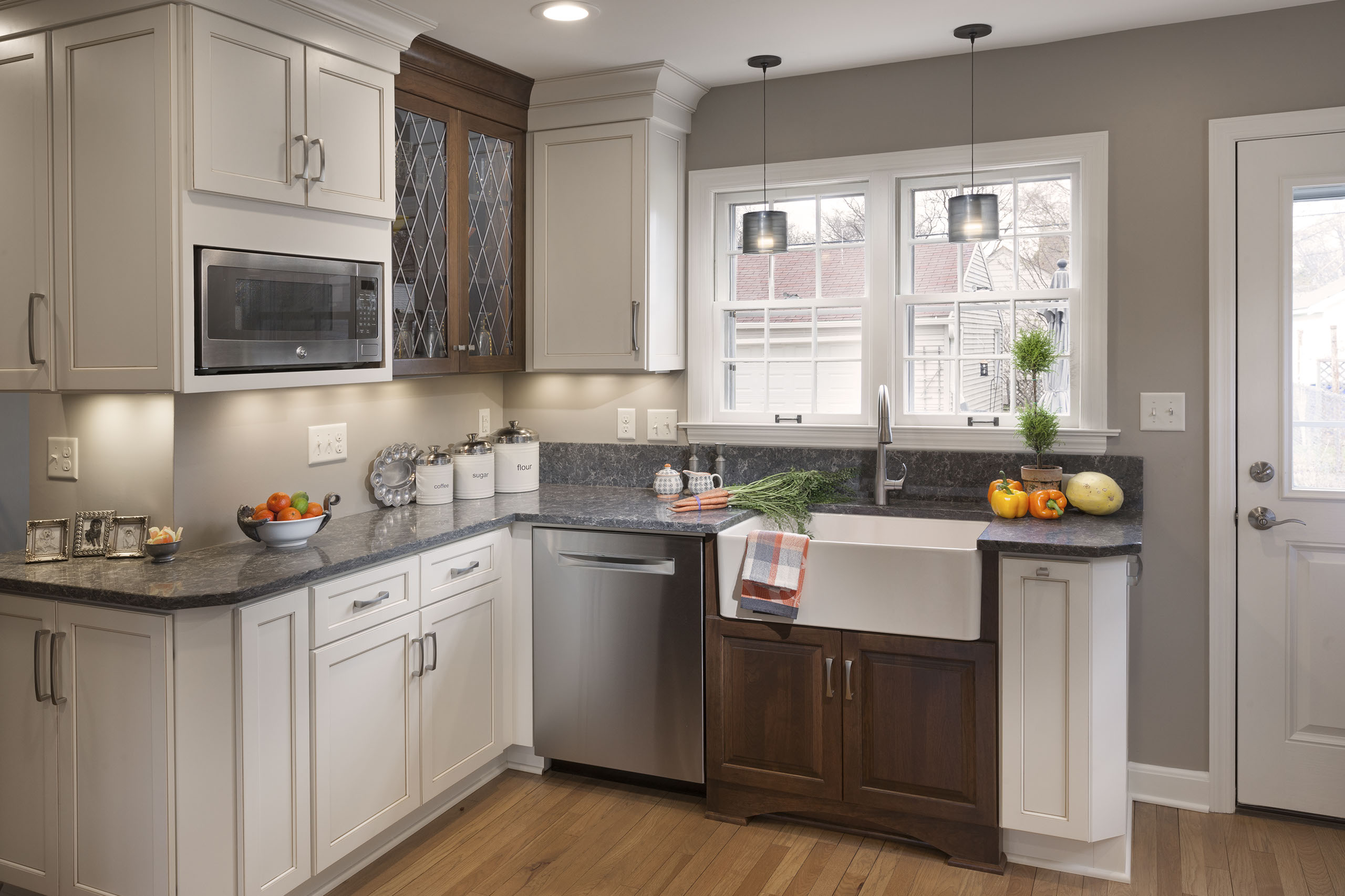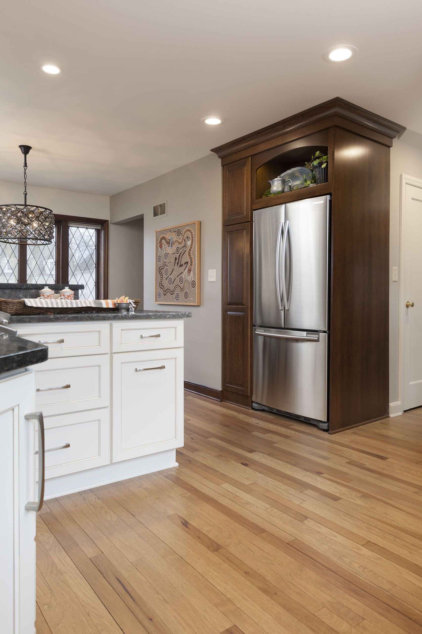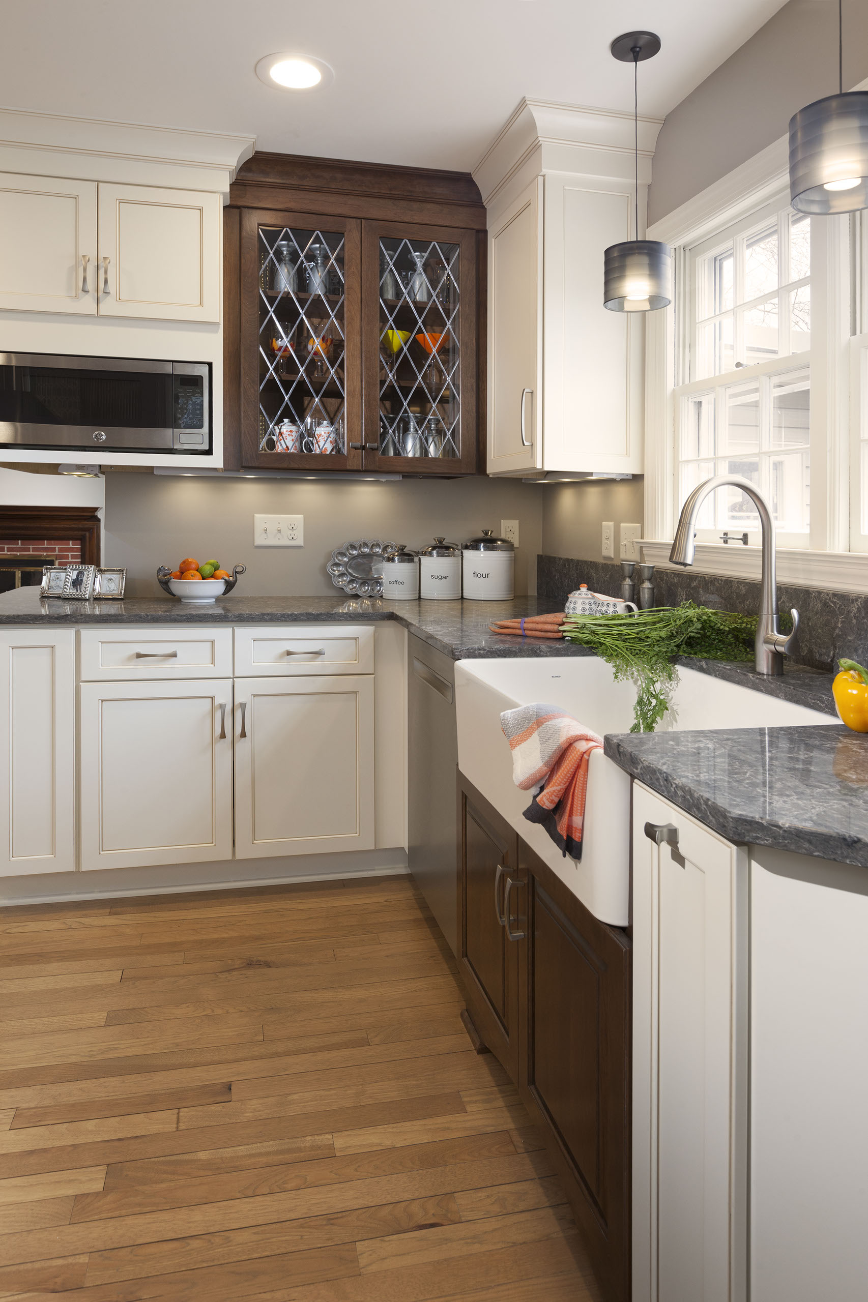 Transitional design for this traditional home combines painted Dura Supreme white maple cabinets and cherry cabinets to coordinate with the existing millwork in the home. Making a remodel not feel like a remodel is my goal for older homes with character. Keeping the existing vibe of the home is key to a quality remodel. Quartz countertops and updated lighting help evolve this space into a modern kitchen. Existing wood floors were refinished to work with the new design.