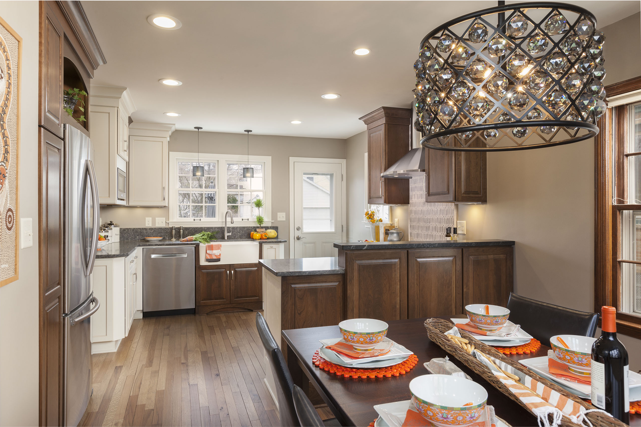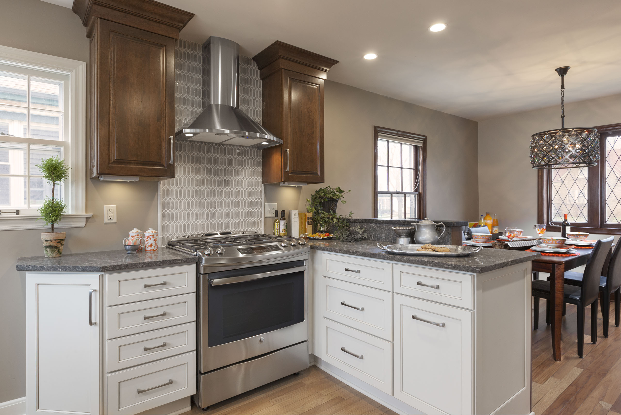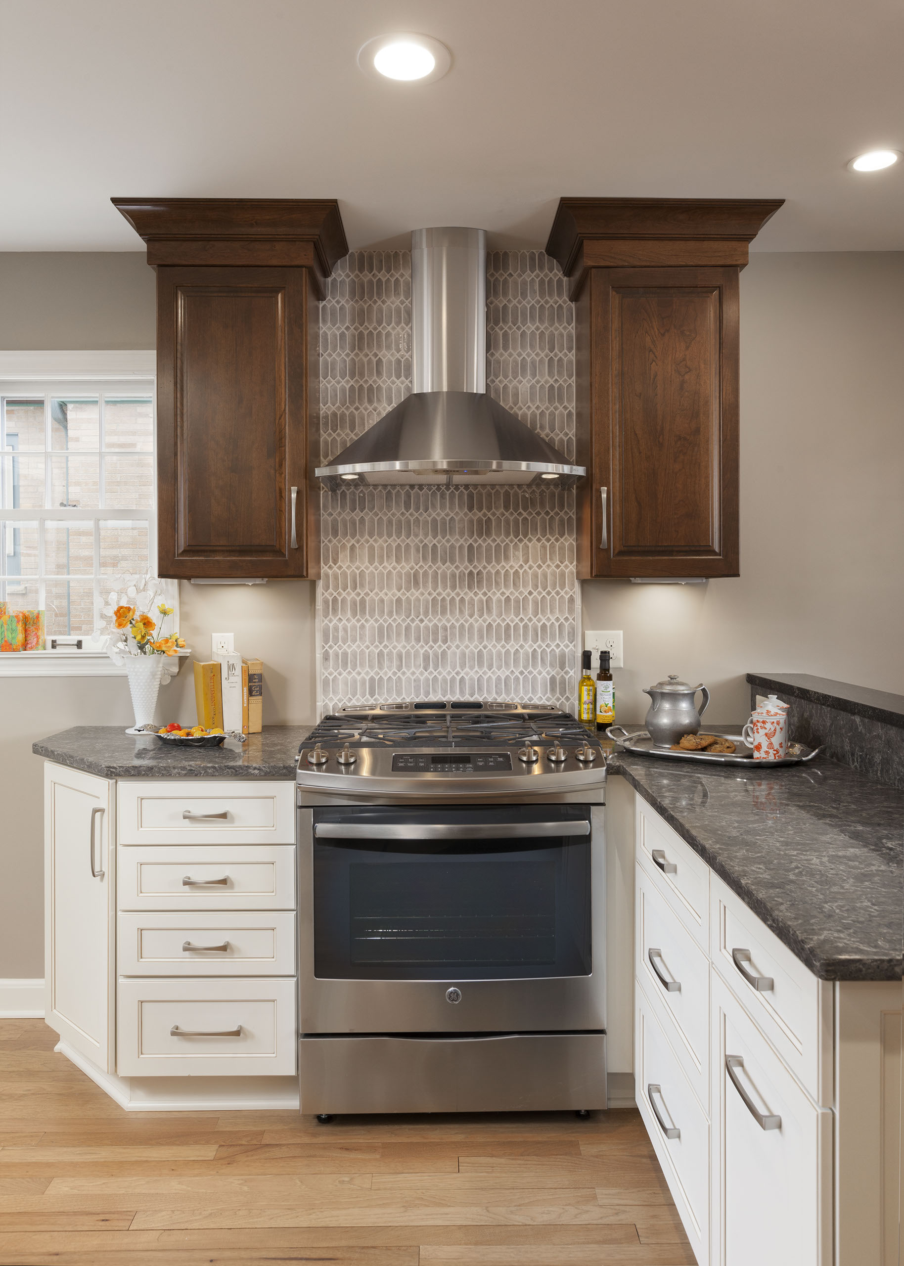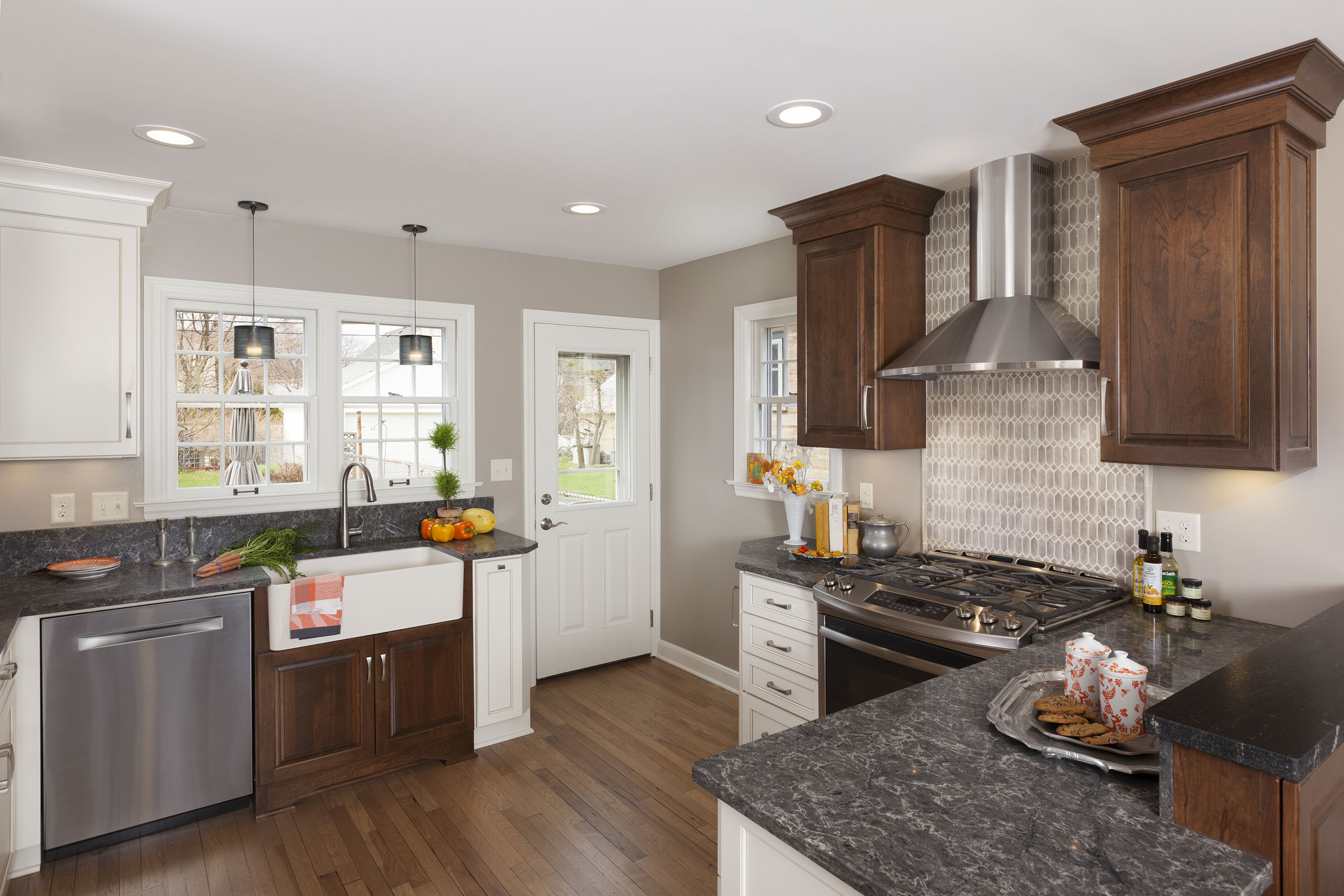 Transitional design for this traditional home combines painted Dura Supreme white maple cabinets and cherry cabinets to coordinate with the existing millwork in the home. Making a remodel not feel like a remodel is my goal for older homes with character. Keeping the existing vibe of the home is key to a quality remodel. Quartz countertops and updated lighting help evolve this space into a modern kitchen. Existing wood floors were refinished to work with the new design.