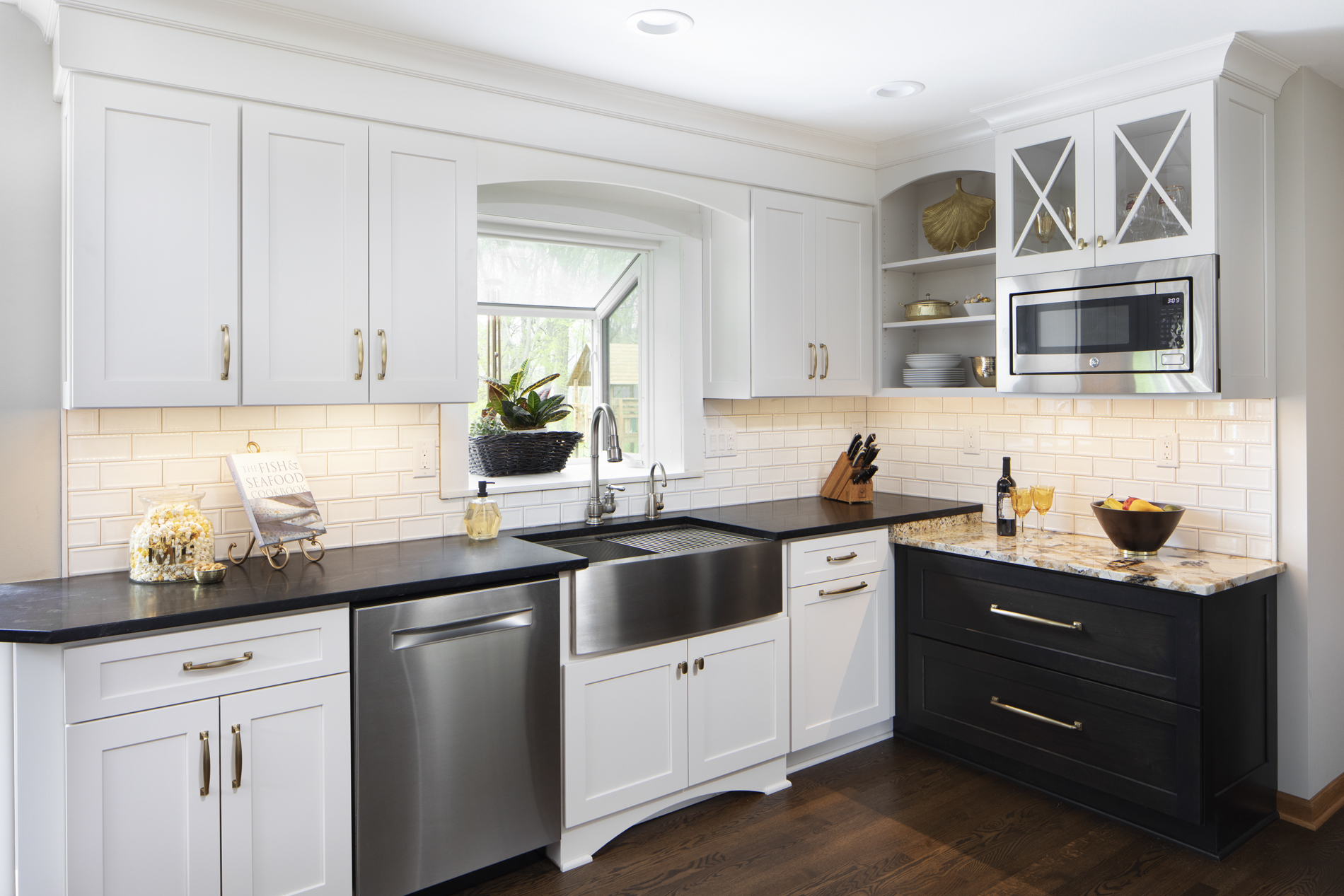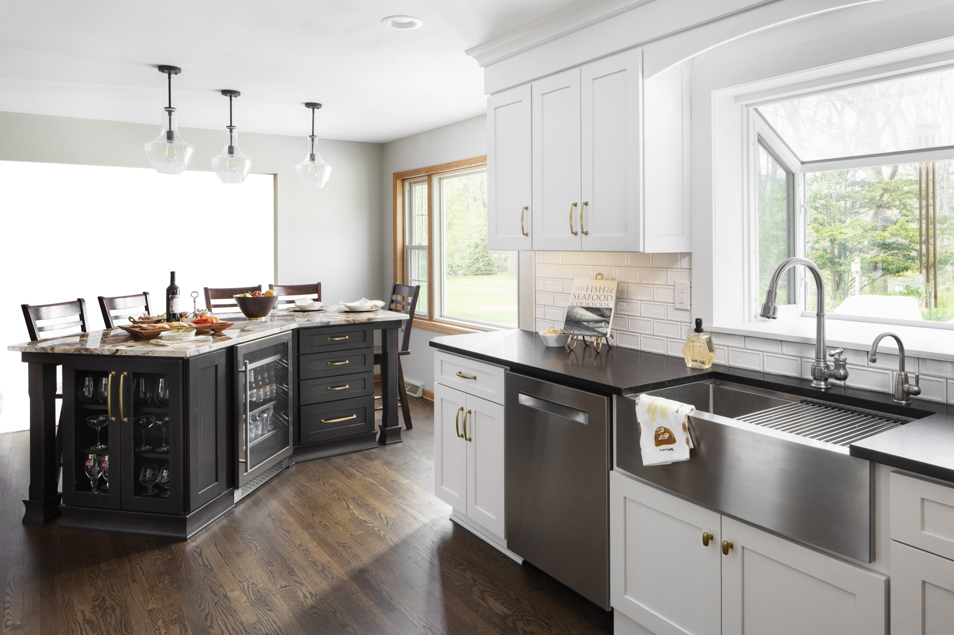 Wonderful expanded kitchen in Hales Corners, WI. Linen White cabinets in Dura Supreme surround a Cherry Peppercorn, Low Sheen stain finish island.