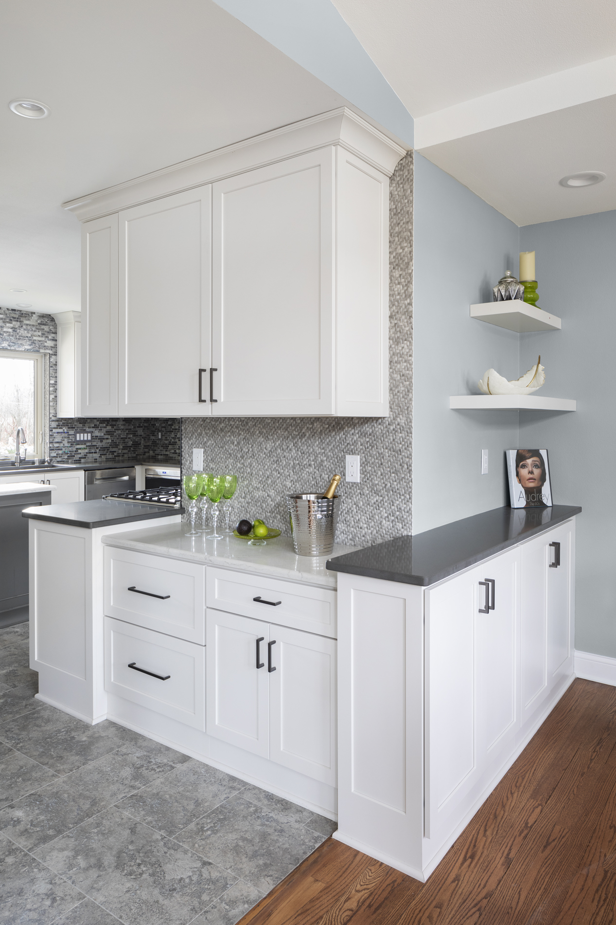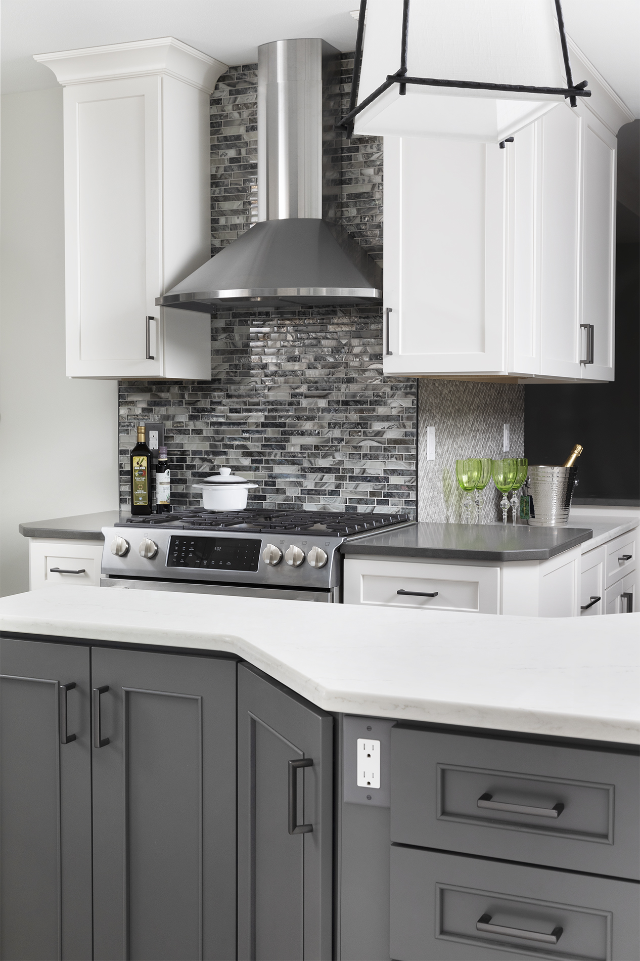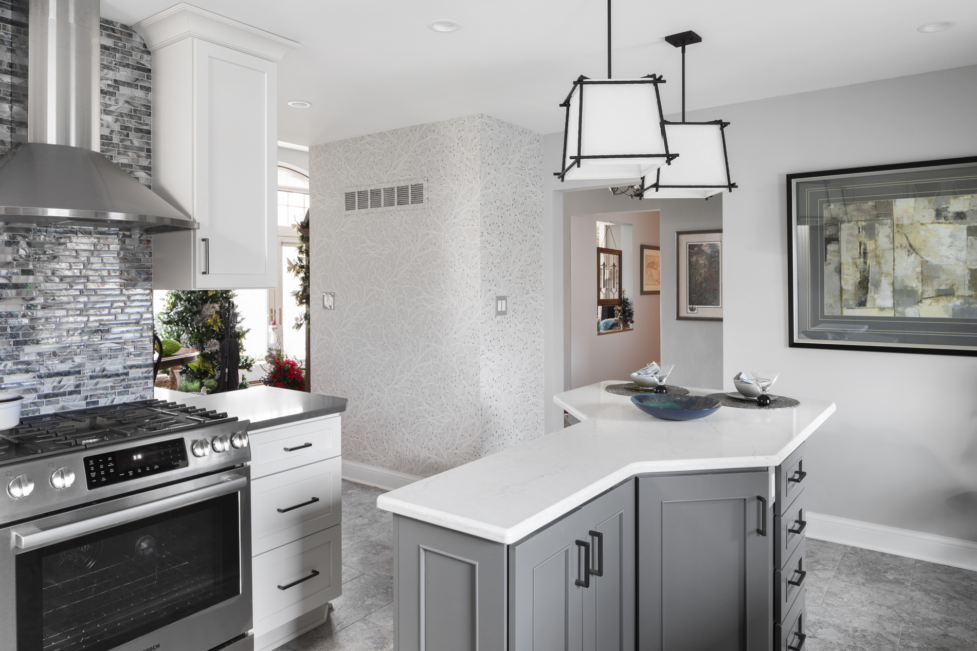 Eat-in kitchen - large transitional u-shaped vinyl floor and gray floor eat-in kitchen idea in Milwaukee with shaker cabinets, white cabinets, quartz countertops, gray backsplash, stone tile backsplash, stainless steel appliances, an island and gray countertops