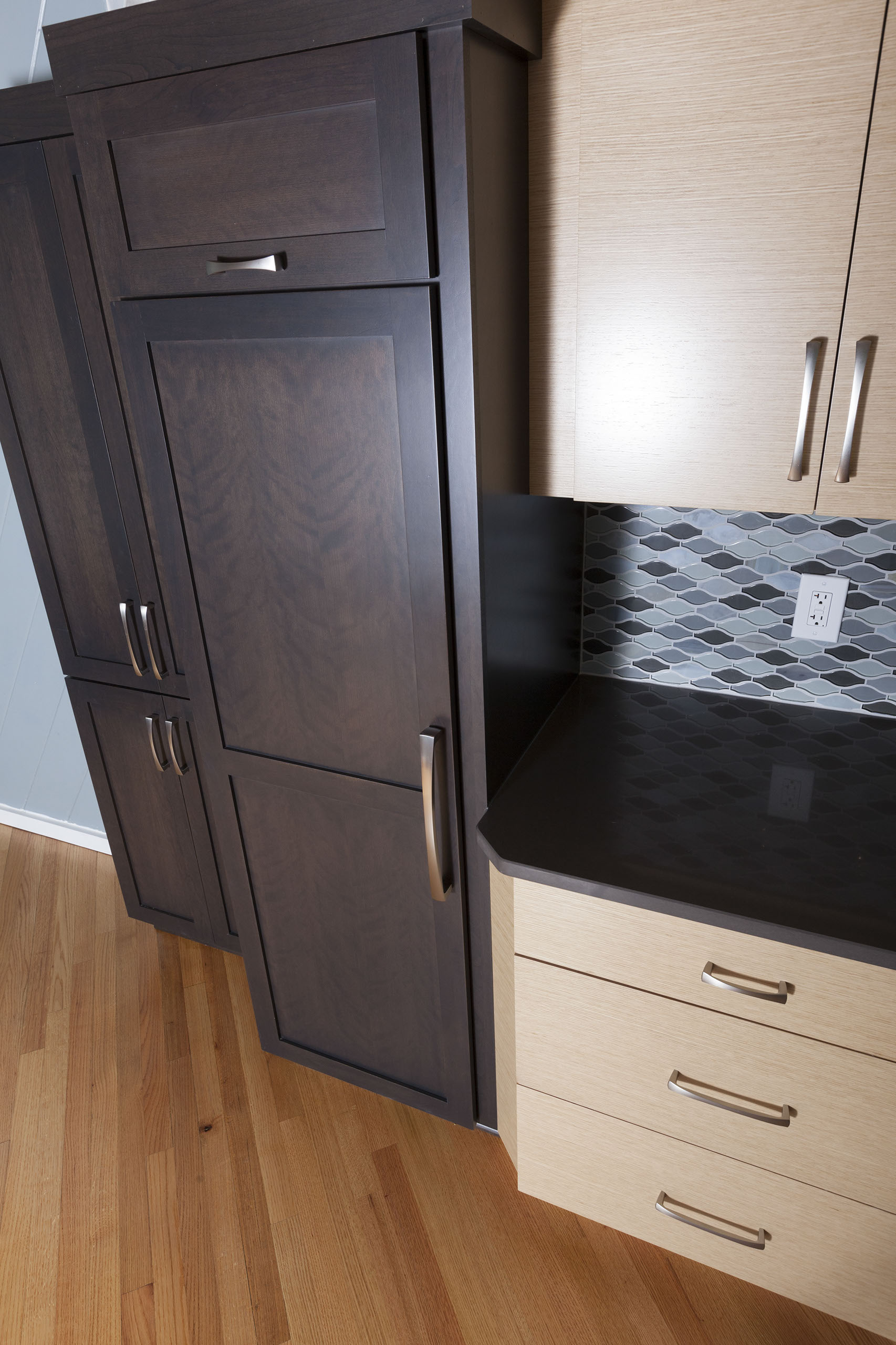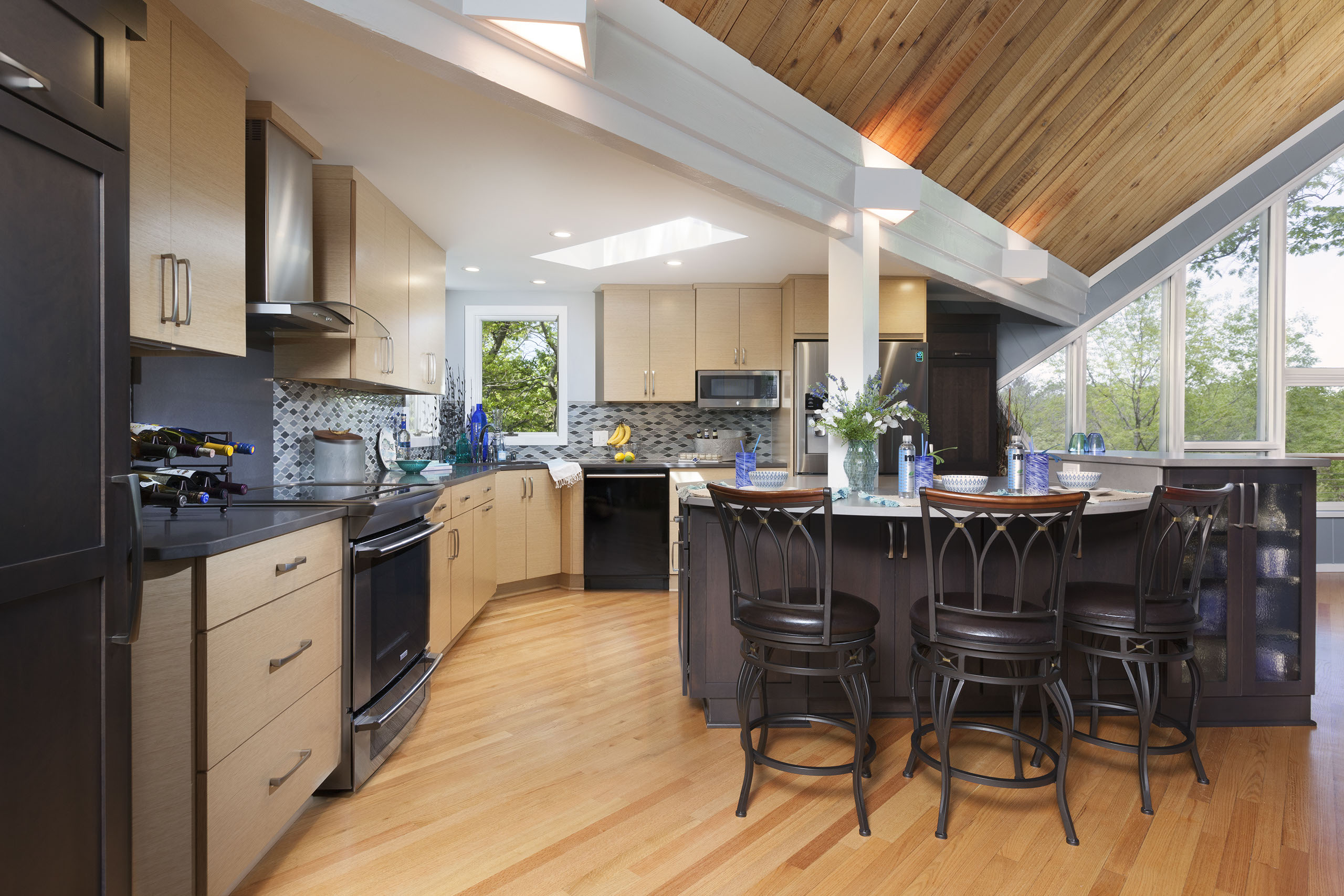 Contemporary design meets angles that needed to be dealt with in a efficient kitchen plan. Combining the dark framed cherry cabinets with the frameless horizontal white oak veneer cabinet finish was the key to this design. The island needed to include a support for the header. Sometimes we need to make these support areas work in a design. The client wanted an island that could seat the entire family and function as an entreating space too.
