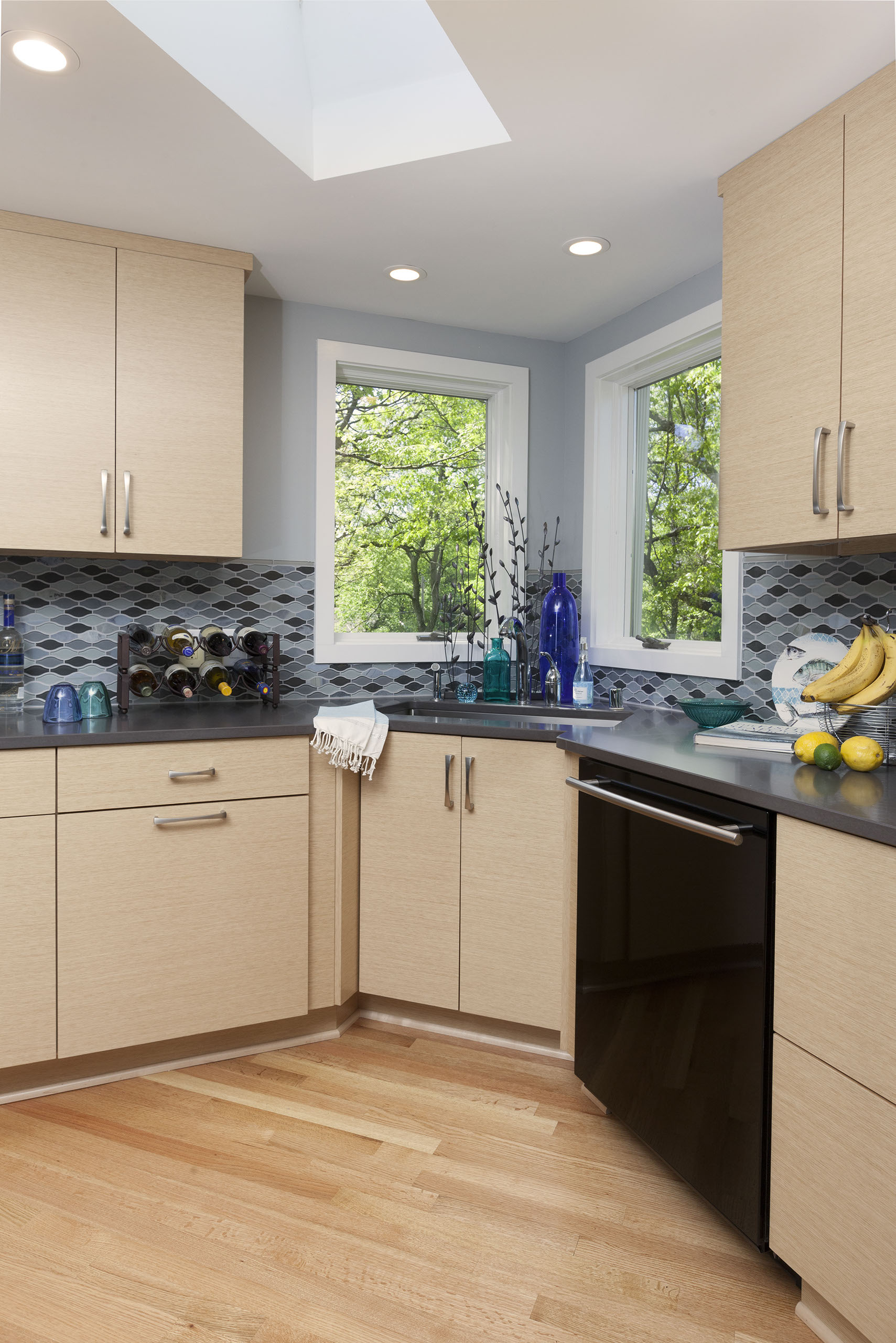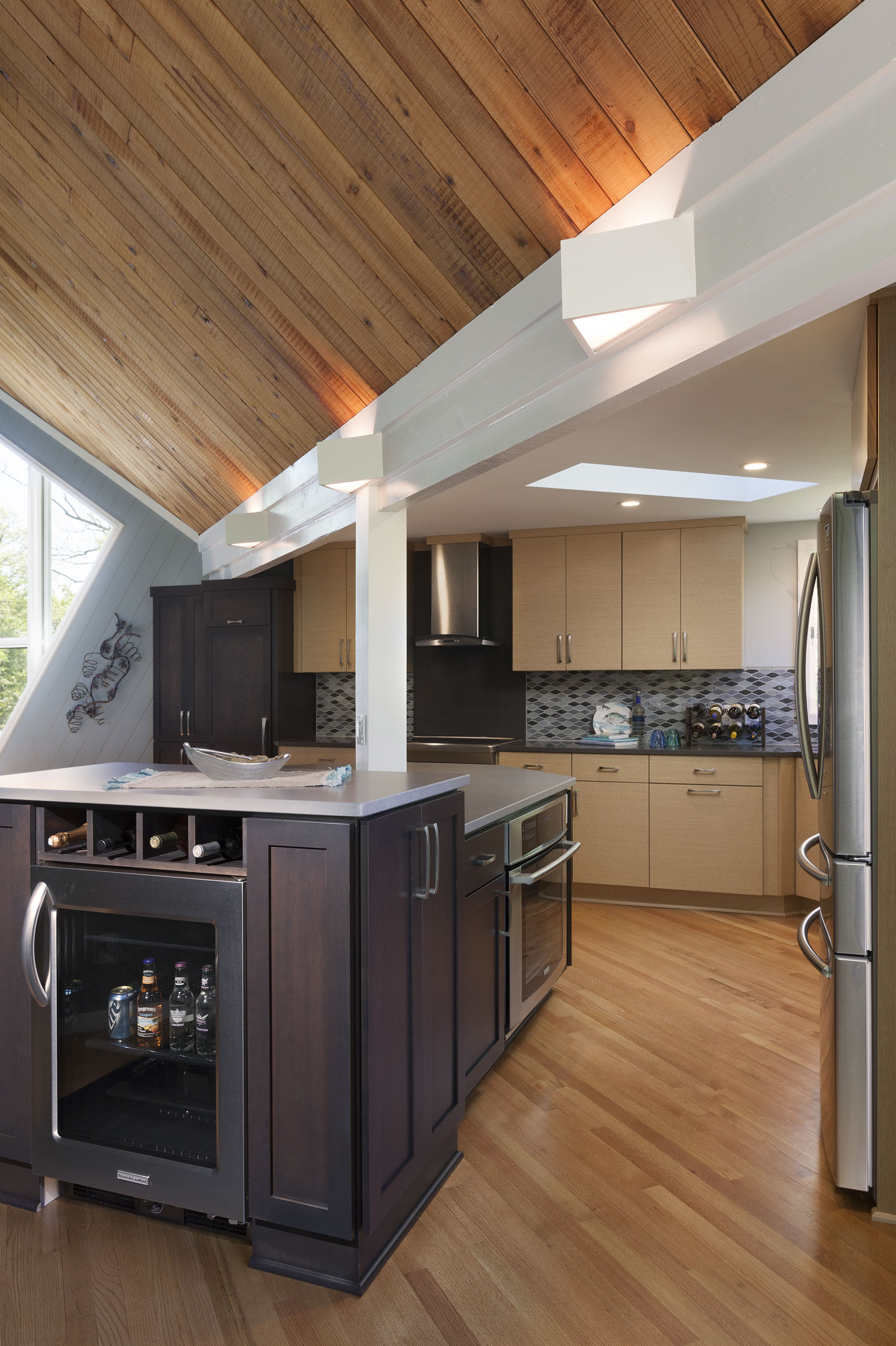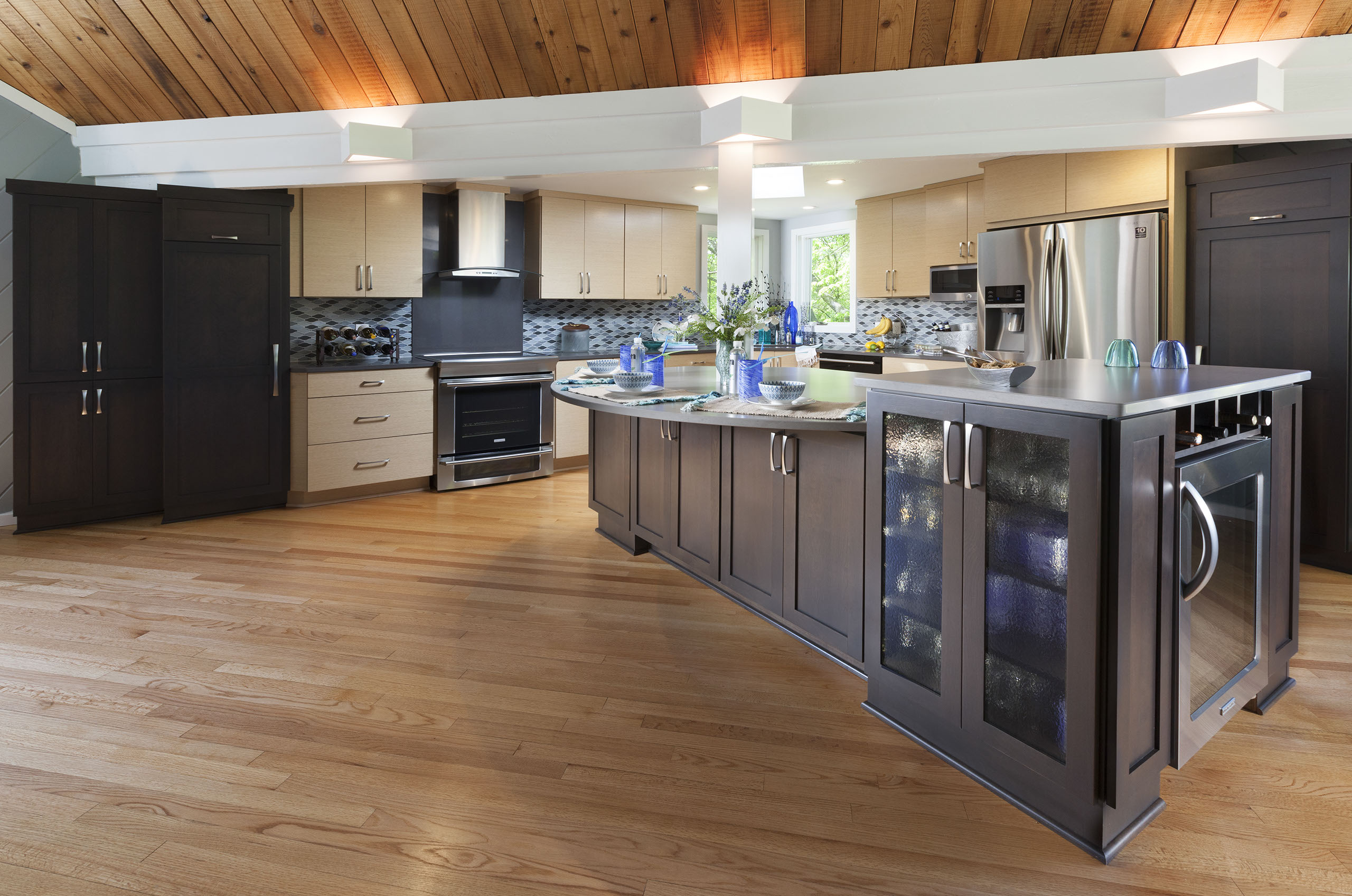 Existing maple floors and cedar ceiling contrast the kitchen with the directional wood grains. Using two quality materials helps to pull the color palette together. The wave in the tile creates a soft movement on the back walls. The wave of movement is a nice contrast to all sharp angles.