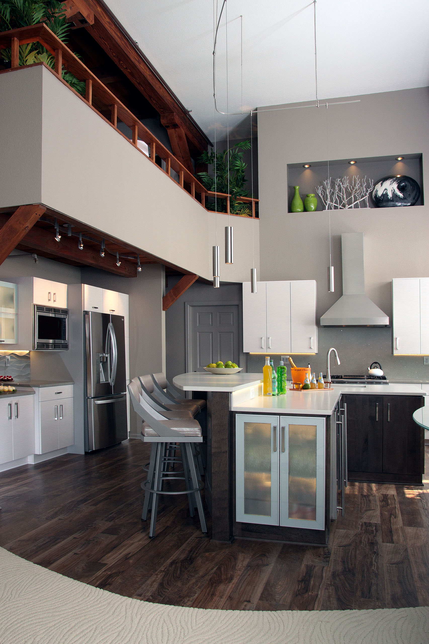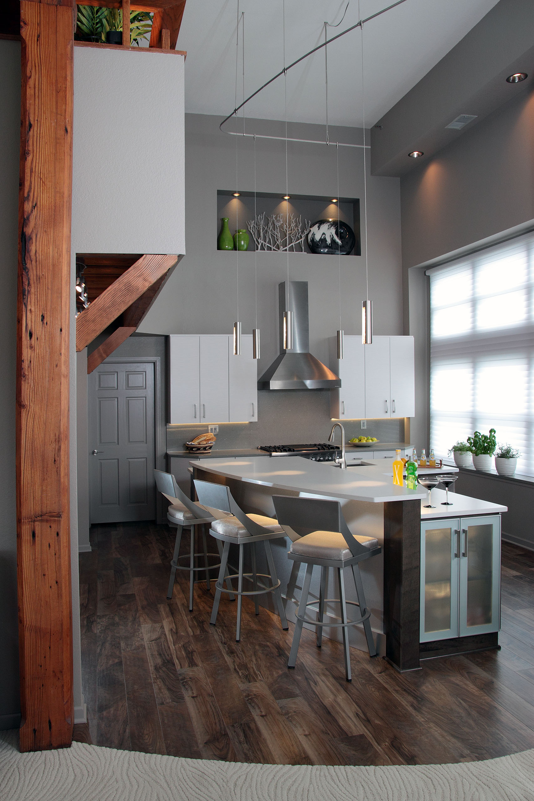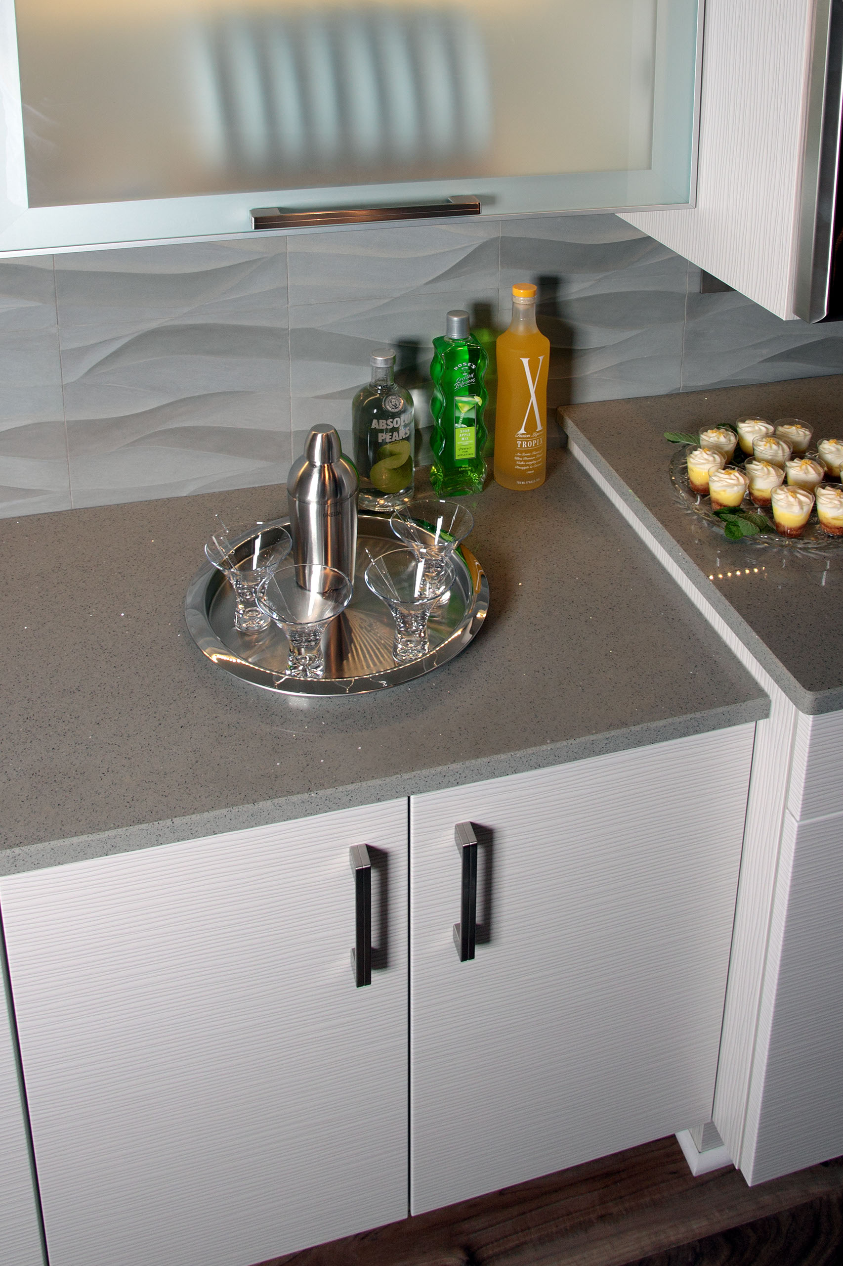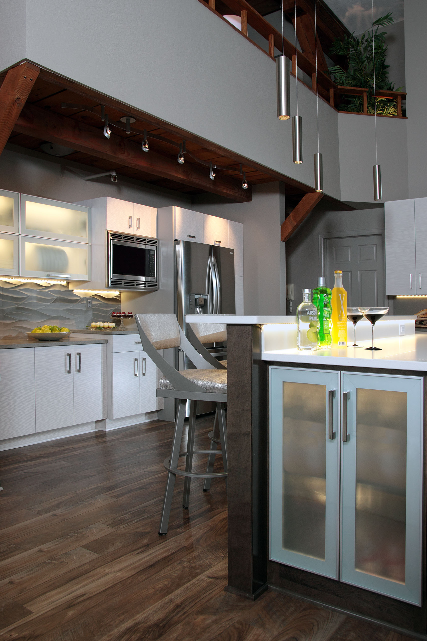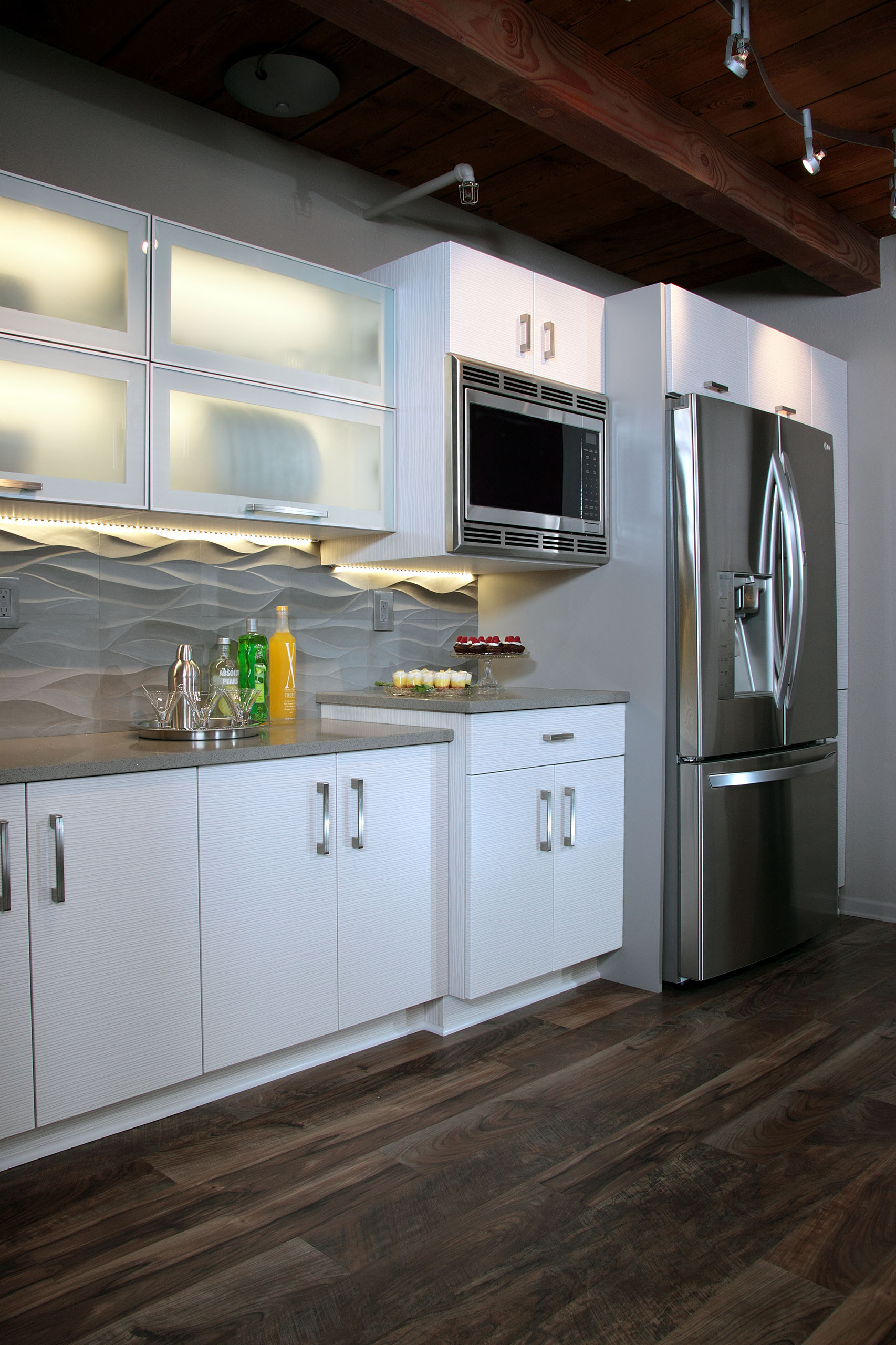 Three door styles meet in this kitchen to pull off a WOW! Frosted glass metal doors, horizontal textured sea salt frameless cabinets and maple stain finish island in a neutral grey work well to contrast the existing beam loft structure. The LVT floor pulls the grey tones and wood beam together with the textures and colors in a faux wood look. Sparkle in the quartz perimeter tops add to the drama of the beautiful contemporary kitchen. The island quartz is a honed material giving a matte contrast in materials. Notice the sculptured tile in the dry bar/microwave. Lighting also adds wonderful area features to this kitchen at nighttime.