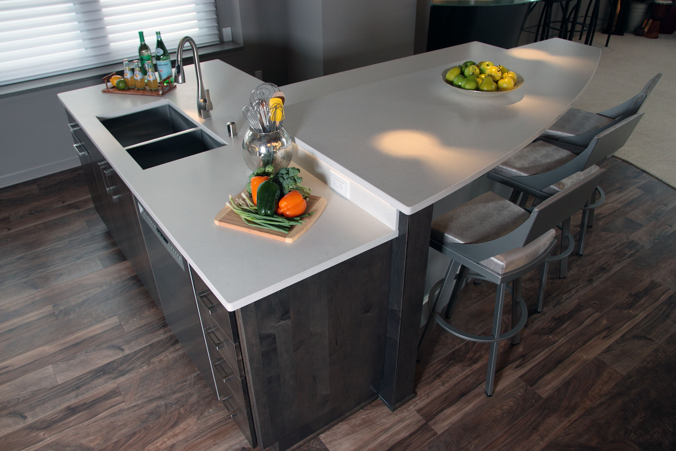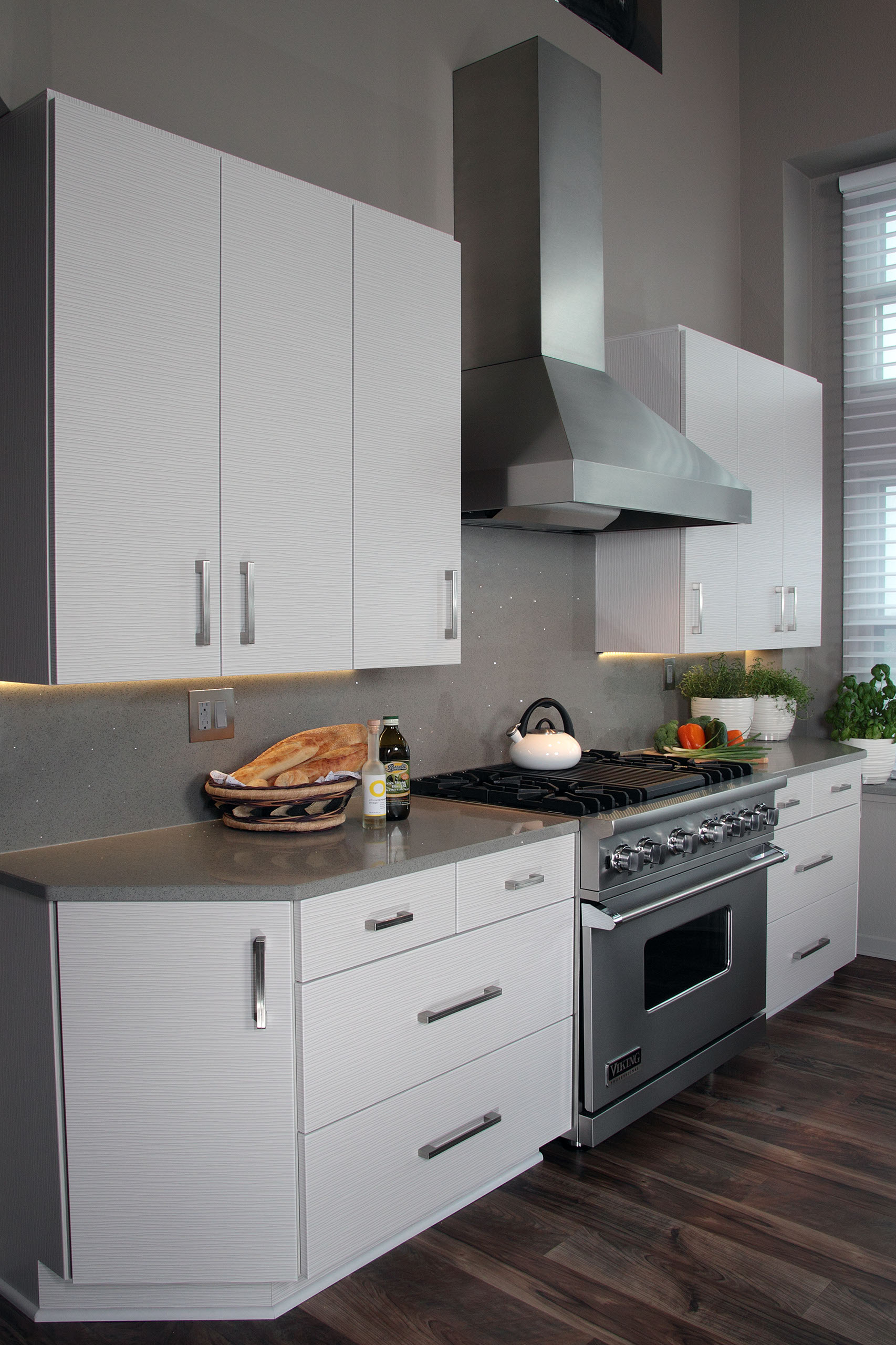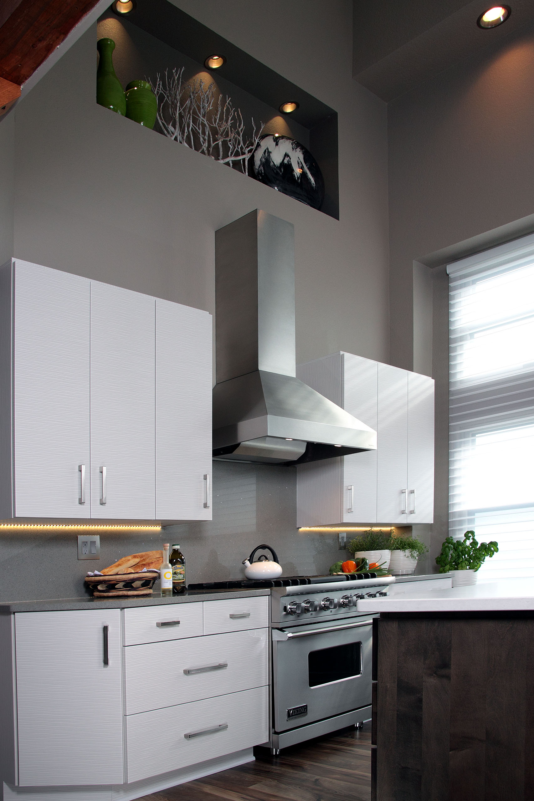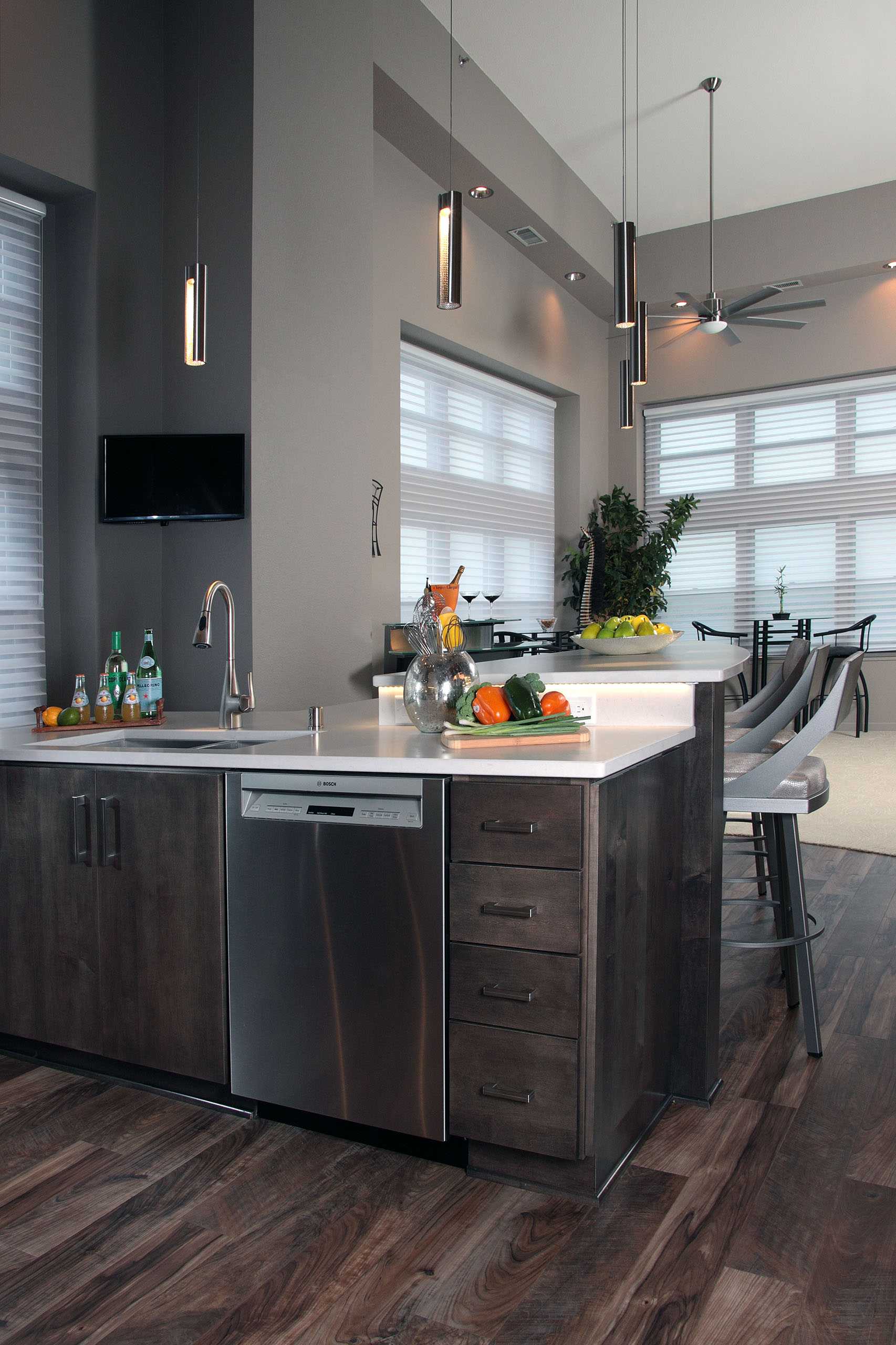 Three door styles meet in this kitchen to pull off a WOW! Frosted glass metal doors, horizontal textured sea salt frameless cabinets and maple stain finish island in a neutral grey work well to contrast the existing beam loft structure. The LVT floor pulls the grey tones and wood beam together with the textures and colors in a faux wood look. Sparkle in the quartz perimeter tops add to the drama of the beautiful contemporary kitchen. The island quartz is a honed material giving a matte contrast in materials. Notice the sculptured tile in the dry bar/microwave. Lighting also adds wonderful area features to this kitchen at nighttime.
