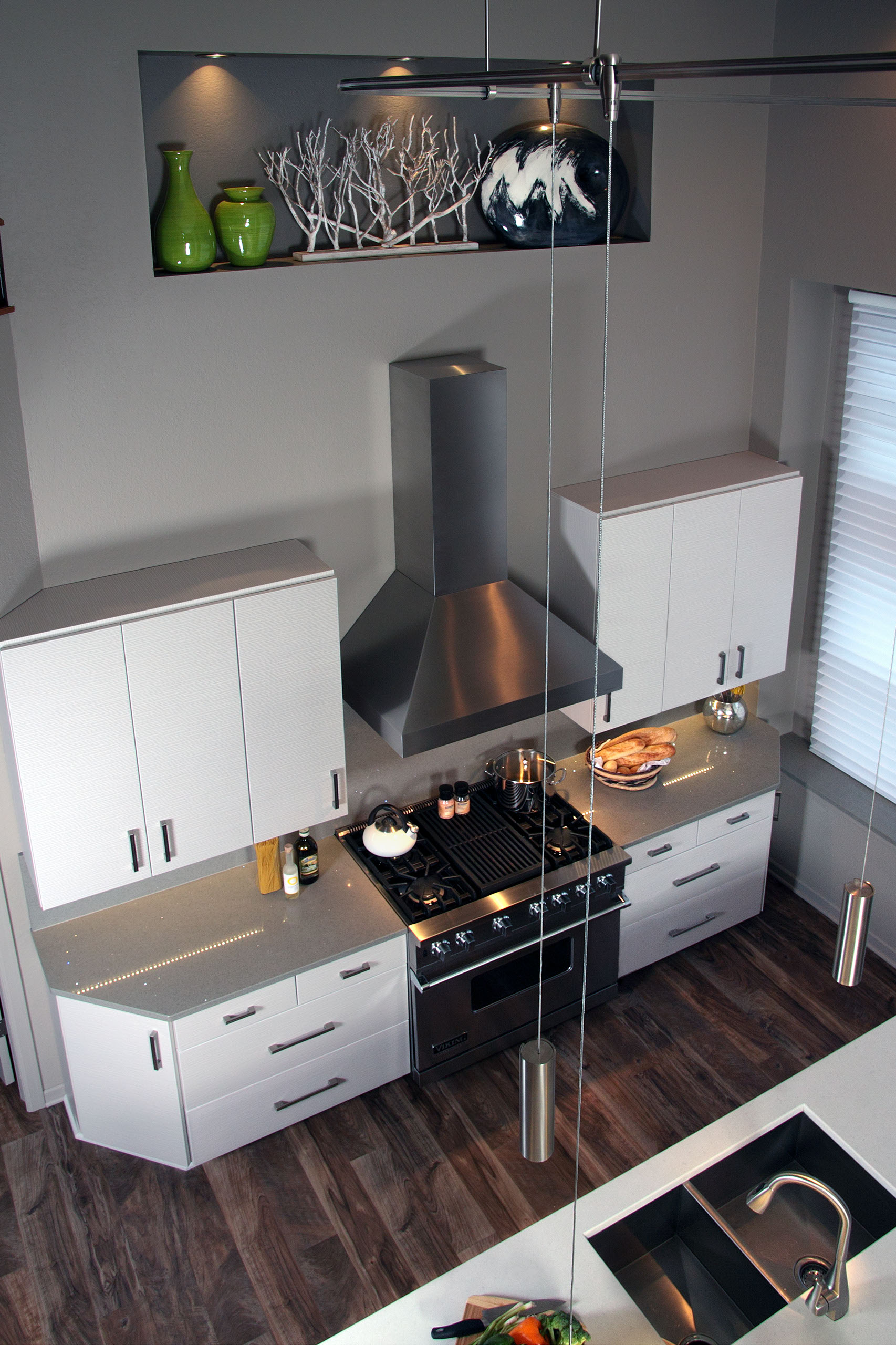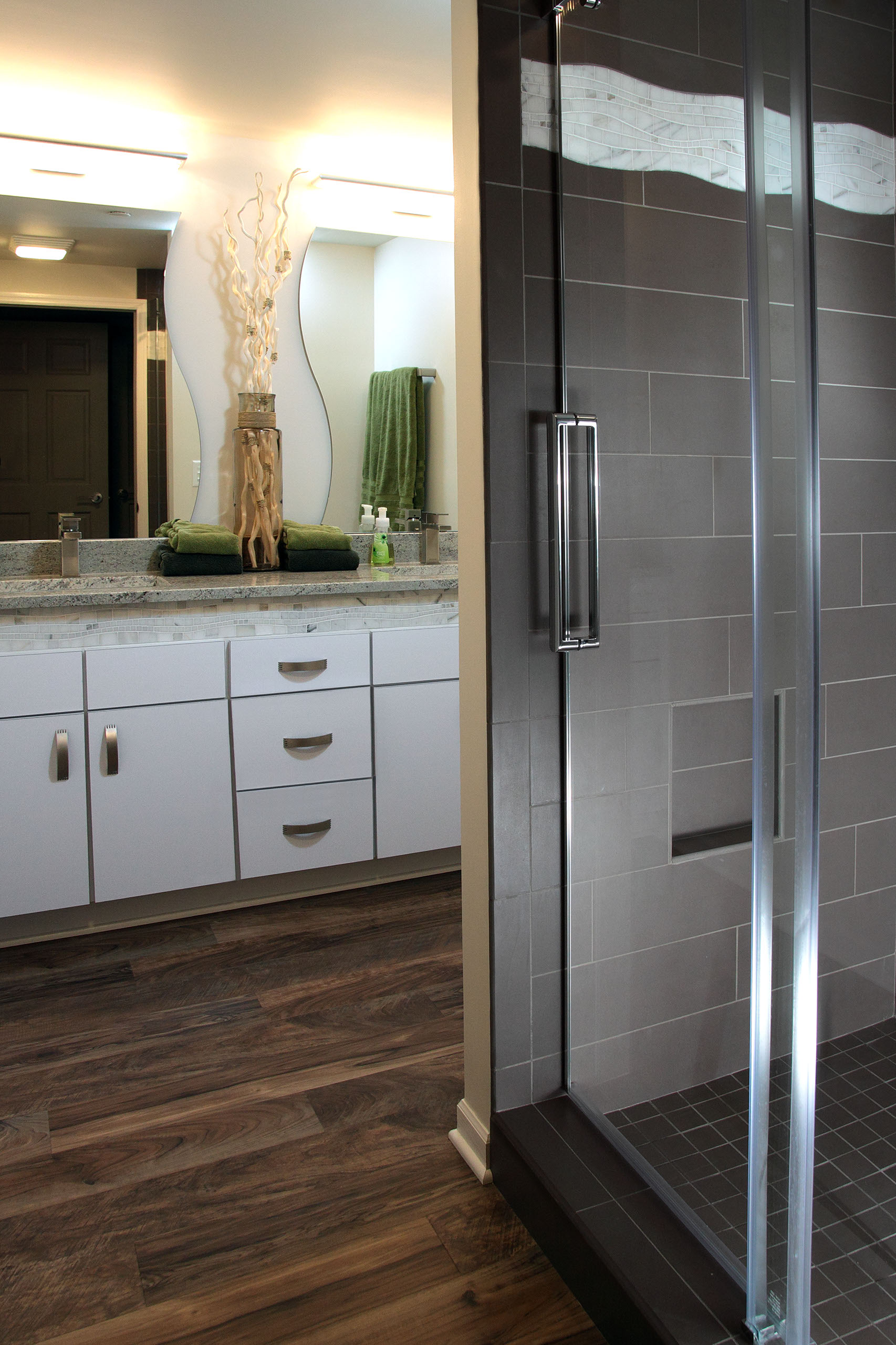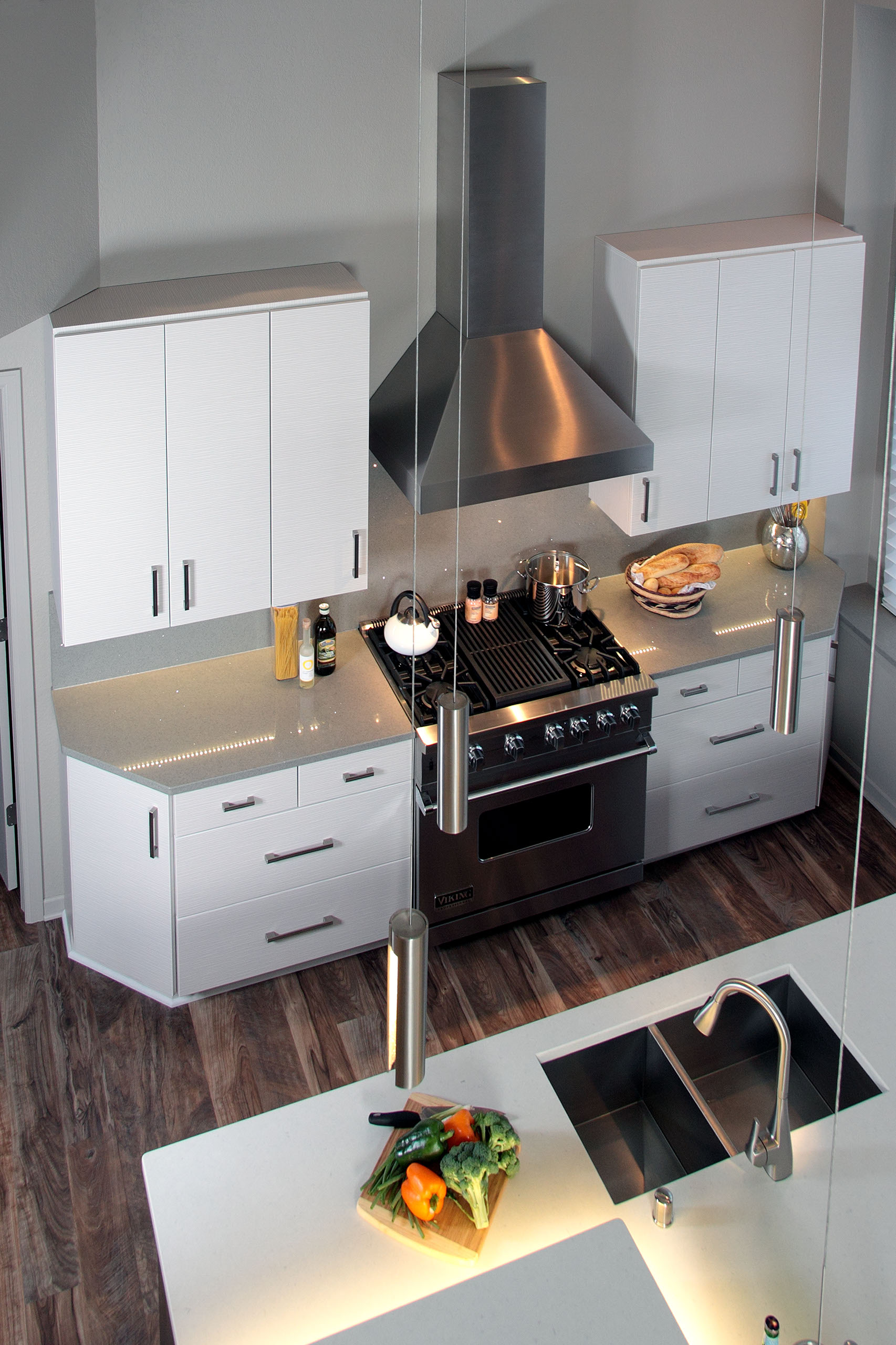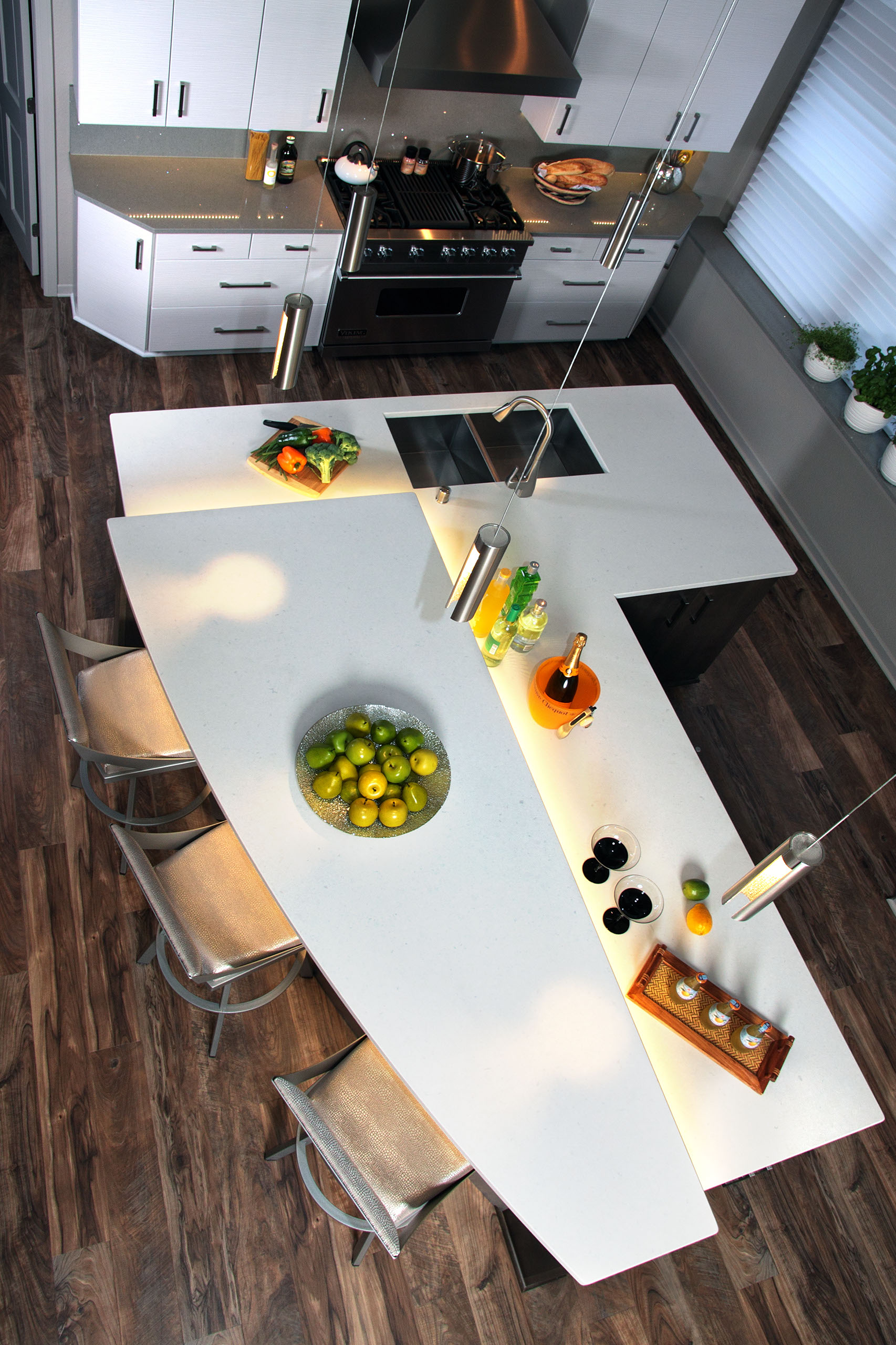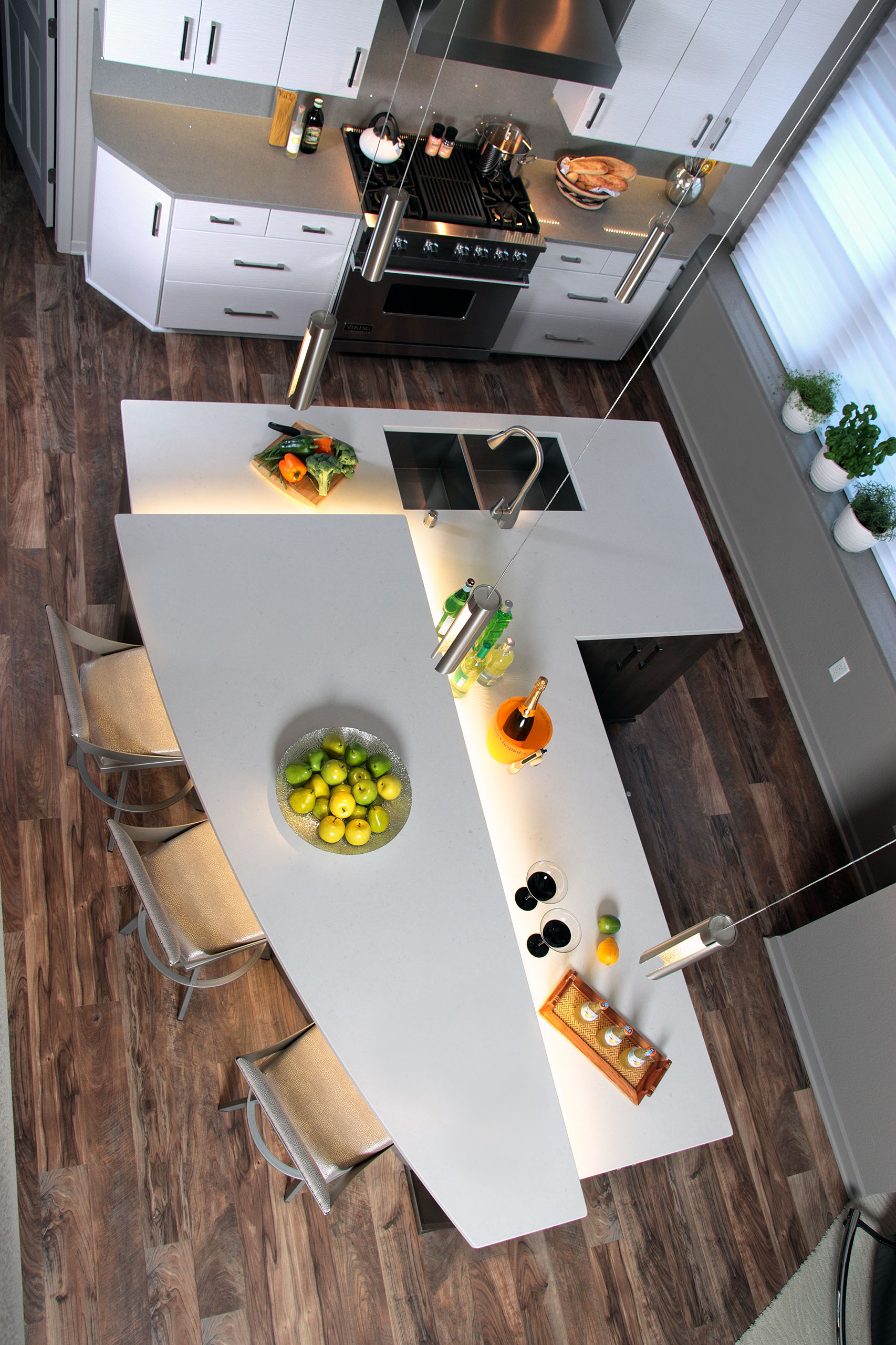 Three door styles meet in this kitchen to pull off a WOW! Frosted glass metal doors, horizontal textured sea salt frameless cabinets and maple stain finish island in a neutral grey work well to contrast the existing beam loft structure. The LVT floor pulls the grey tones and wood beam together with the textures and colors in a faux wood look. Sparkle in the quartz perimeter tops add to the drama of the beautiful contemporary kitchen. The island quartz is a honed material giving a matte contrast in materials. Notice the sculptured tile in the dry bar/microwave. Lighting also adds wonderful area features to this kitchen at nighttime.