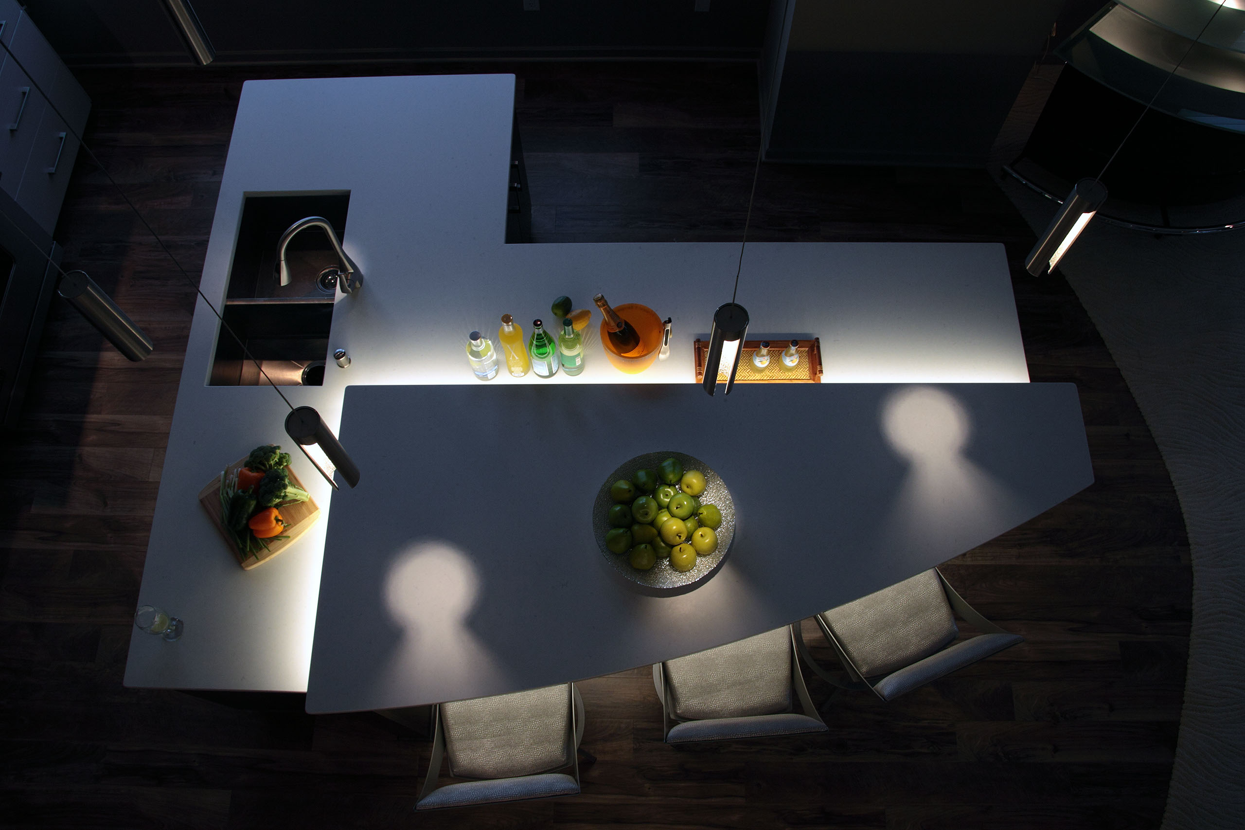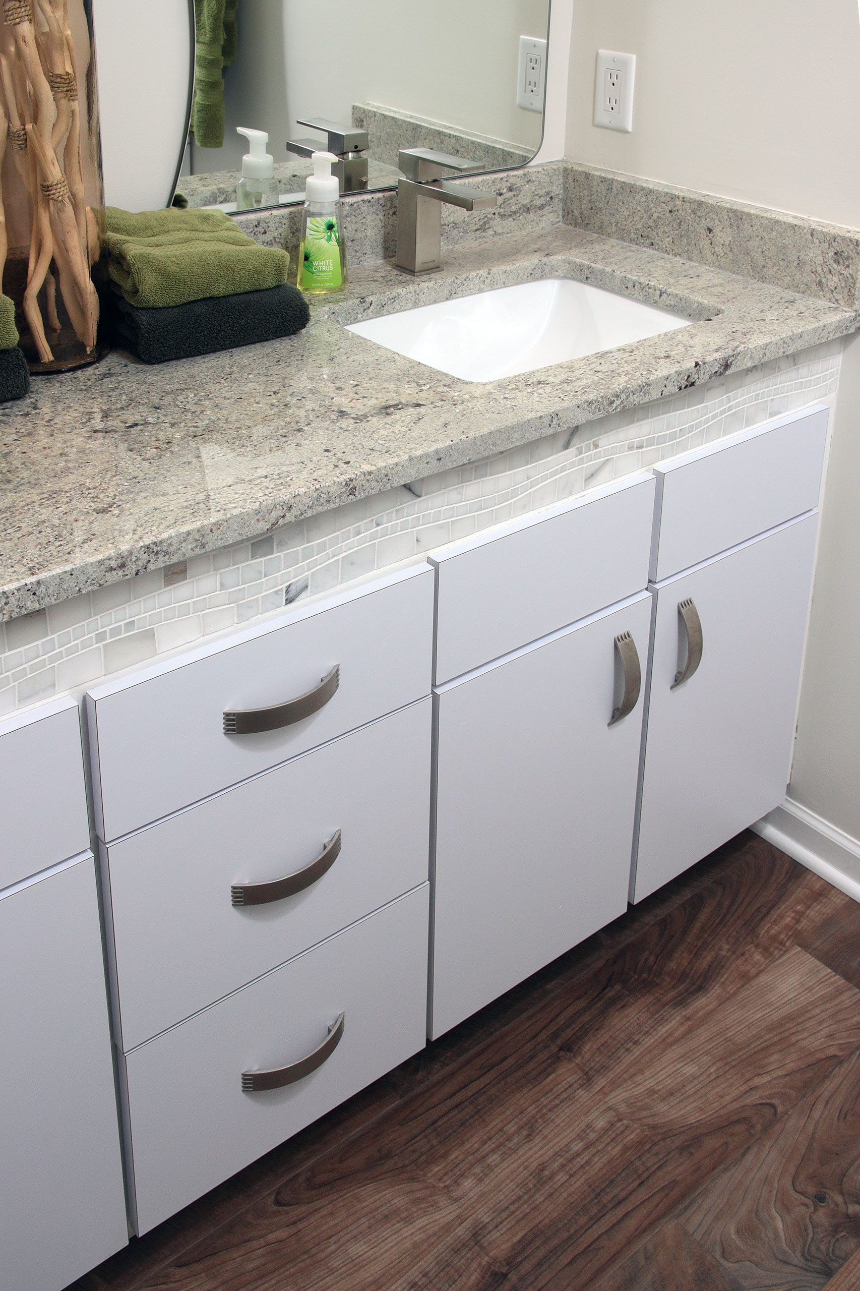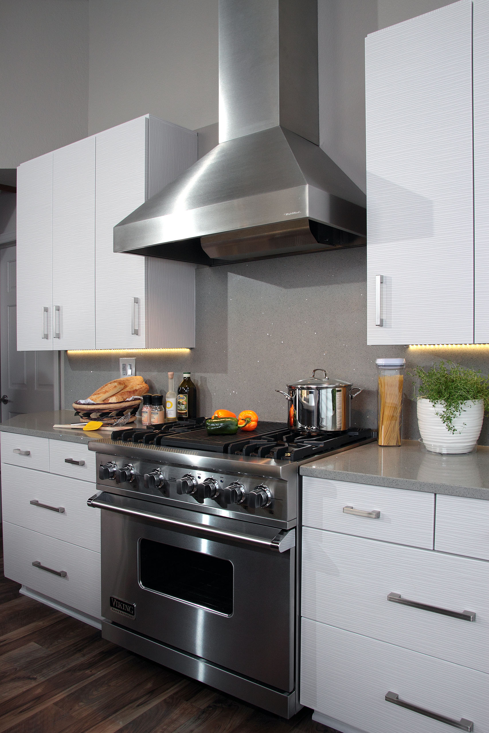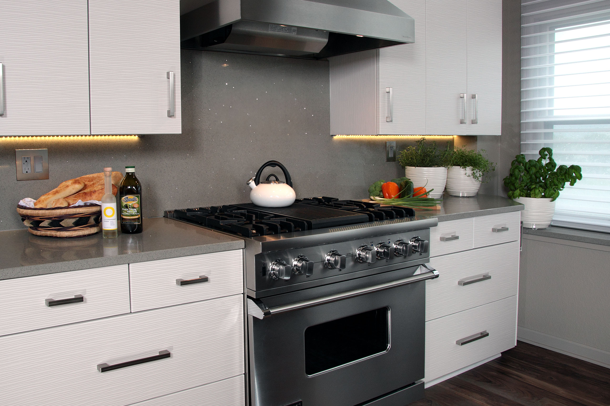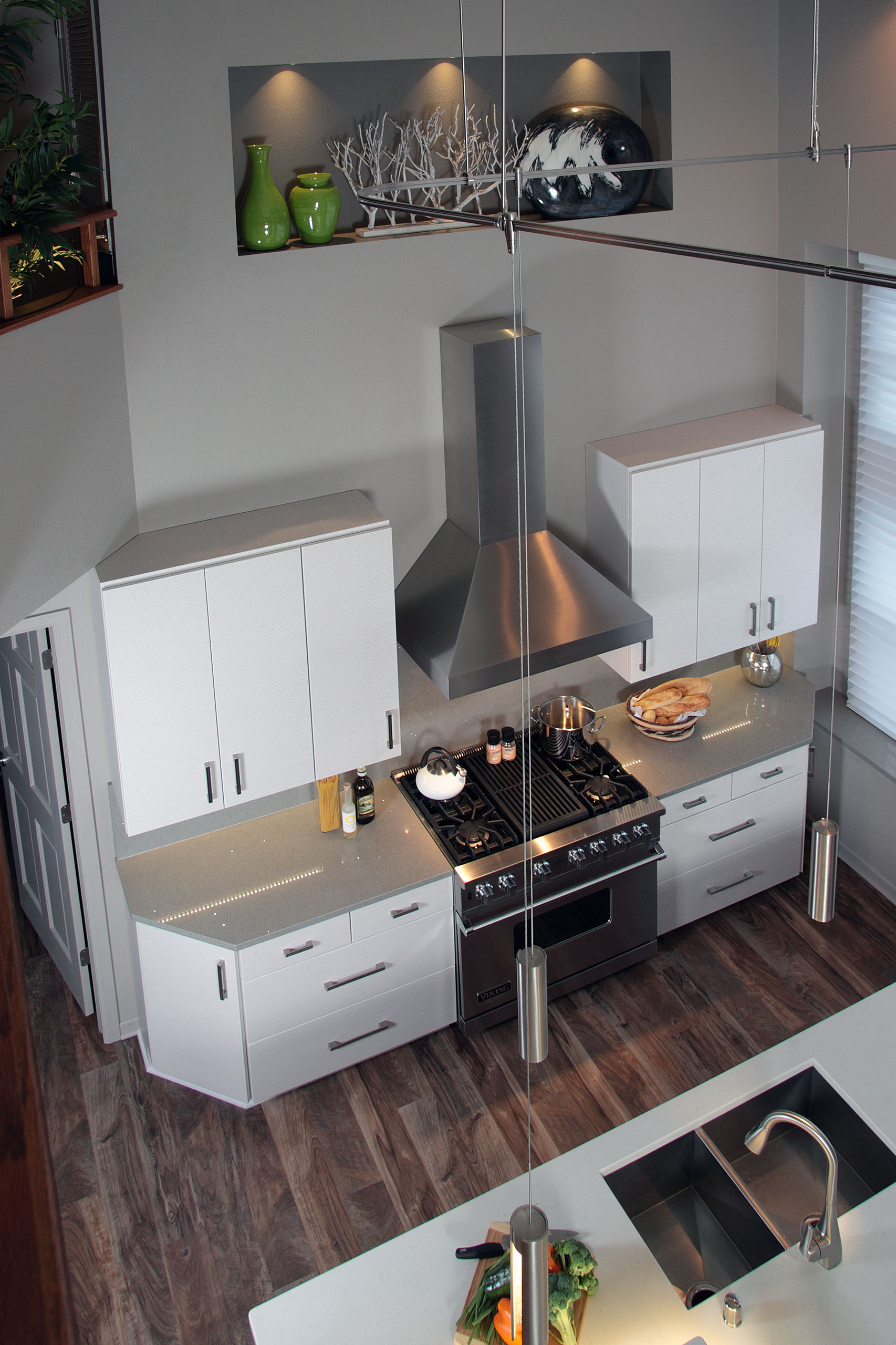 Three door styles meet in this kitchen to pull off a WOW! Frosted glass metal doors, horizontal textured sea salt frameless cabinets and maple stain finish island in a neutral grey work well to contrast the existing beam loft structure. The LVT floor pulls the grey tones and wood beam together with the textures and colors in a faux wood look. Sparkle in the quartz perimeter tops add to the drama of the beautiful contemporary kitchen. The island quartz is a honed material giving a matte contrast in materials. Notice the sculptured tile in the dry bar/microwave. Lighting also adds wonderful area features to this kitchen at nighttime.